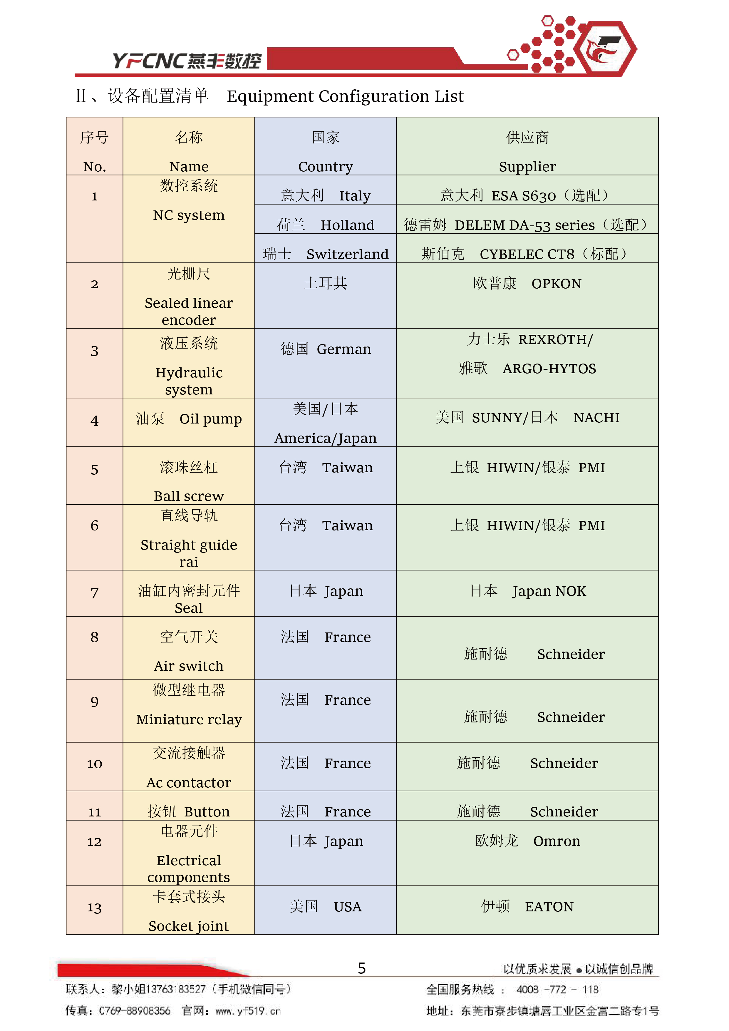 数控系统:意大利ESAS630(选配) 荷兰德雷姆DELEM DA-53series (选配) 瑞士斯伯克CYBELEC CT8(标配) 光栅尺:土耳其:欧普康OPKON 液压系统:力士乐(德国)雅歌 油泵:美国/日本 滚珠丝杠:台湾Taiwan上银HIWIN/银泰PMI 直线导轨:台湾Taiwan上银HIWIN/银泰PMI 油缸内密封元件:日本Japan NOK 空气开关:法国France施耐德 电器元件:日本Japan欧姆龙Omron 卡套式接头:美国伊顿